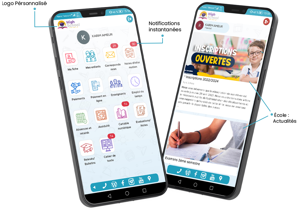 Découvrez notre nouvelle application eMadariss Mobile révolutionnaire, conçue pour faciliter la communication entre votre établissement, les parents et les élèves ! ainsi à établir un environnement d’apprentissage de qualité pour vos élèves et à encourager l’excellence.